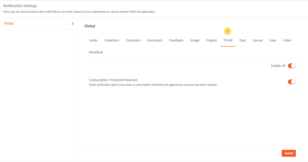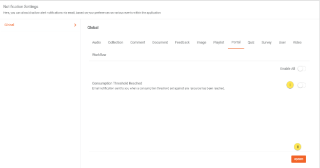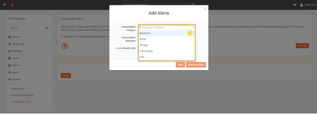 VIDIZMO grants user an extensive monitoring mechanism for the resources being consumed in their Account by providing the ability to set Consumption Alerts. Organizations can create multiple thresholds by setting certain percentages of the allowed package limits for which the consumption is being incurred. This caters to the needs of organizations in preventing overages and additional cost peaks at the end of their Billing Period by receiving email notifications whenever a threshold set for a particular resource is exceeded.
