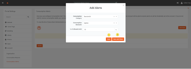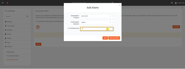 5. Enter the percentage of Allowed Limit you want to set an alert on the selected Consumption Category and Resource.