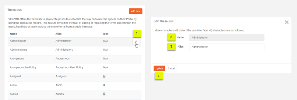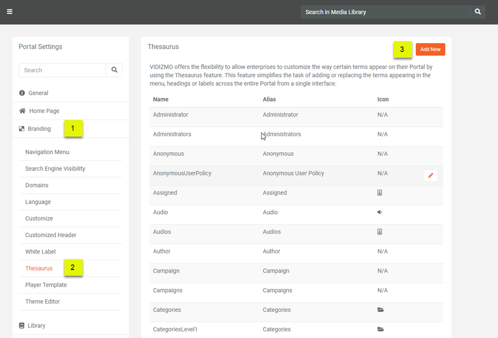 VIDIZMO offers the flexibility to allow enterprises to customize the way specific terms appear on their Portals by using the Thesaurus feature. This feature simplifies the task of adding or replacing the terms appearing in the menu, headings, or labels across the entire Portal from a single interface.