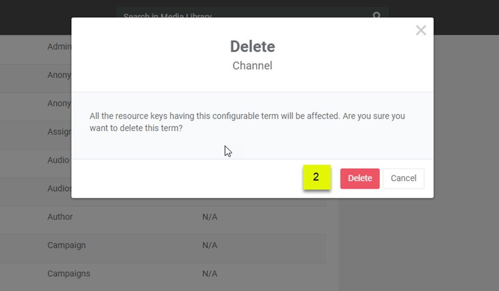 A popup appears; click on the Delete button to proceed. Once clicked, your Configurable Term no longer appears on the list and will be deleted successfully.