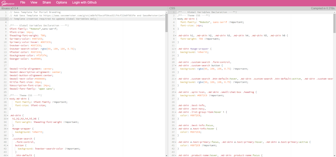 Now, after making changes to the template here, copy the CSS code compiled against your changes, as shown below. You will also see a brief indication at the top-right of your CSS code reflecting the time it took to compile your changes.