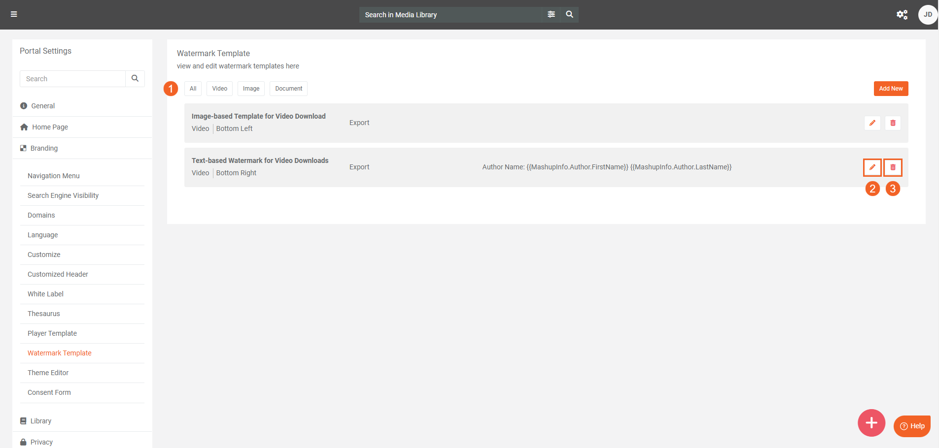 VIDIZMO enables you to create watermark templates that ensure consistent and standardized application of watermarks on your content. You can create two types of watermark templates: one for use during encoding and another for use during export or download.