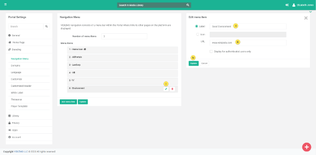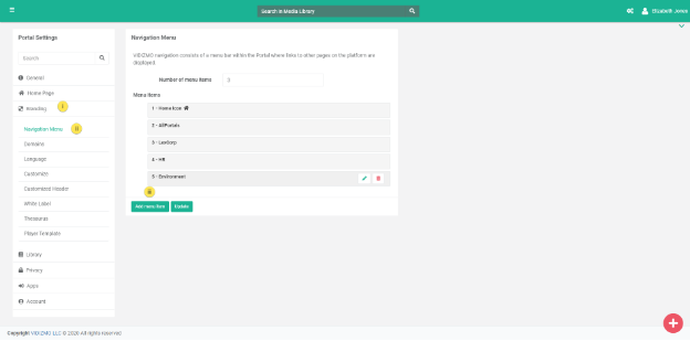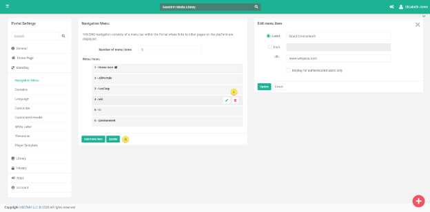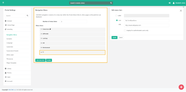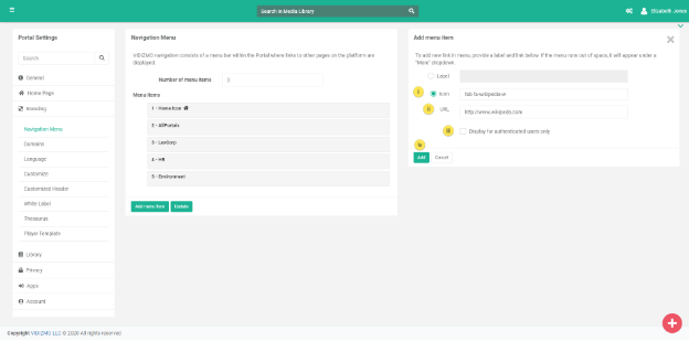 VIDIZMO allows Managers and Administrators to customize the Portal's navigation menu and add links to any resource that can be accessed via a URL. This can be a VIDIZMO Portal, category, published media, external web page, and/or intranet site, etc. The navigation menu appears on the Portal's main navigation displaying either the label (text) or icon for a link. VIDIZMO enables the users to create, edit or delete any menu item as required. If the menu list runs out of space, a dropdown menu will automatically appear on the Portal's main navigation.