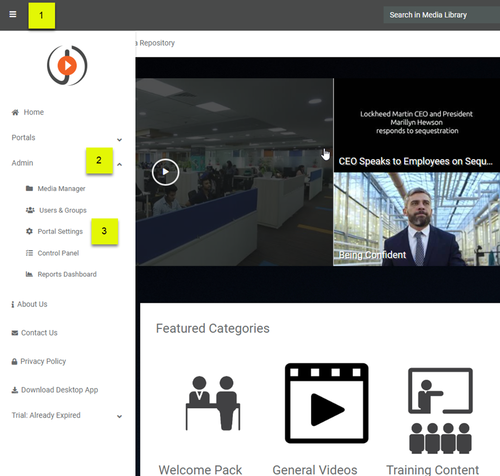 Note: Portal's description is displayed as a header on the Media Library page, but it will be overridden by the customized header's message.