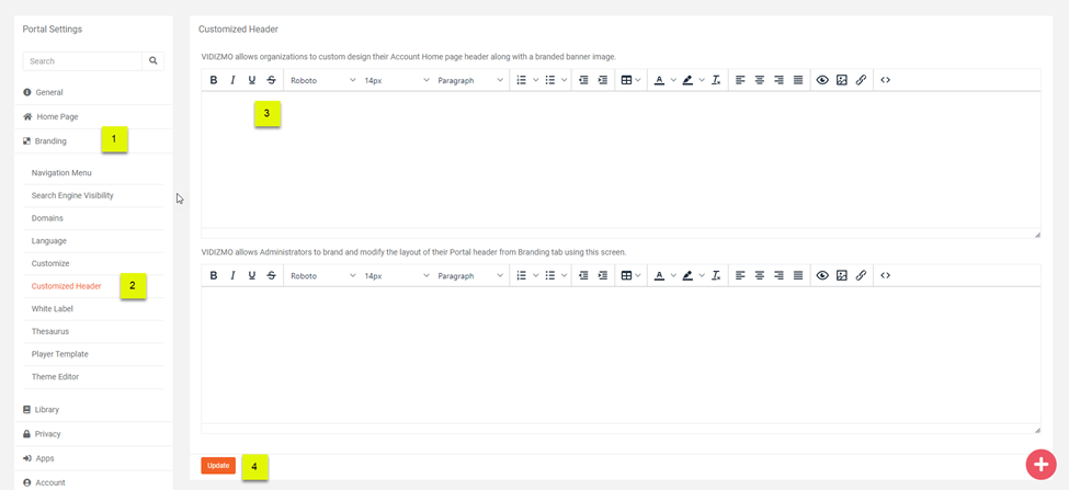 You will see the HTML editor under the editor for Portal Header. Write or Paste your code here. The users can type in their own HTML styles to brand the banner for their Portal's Homepage.