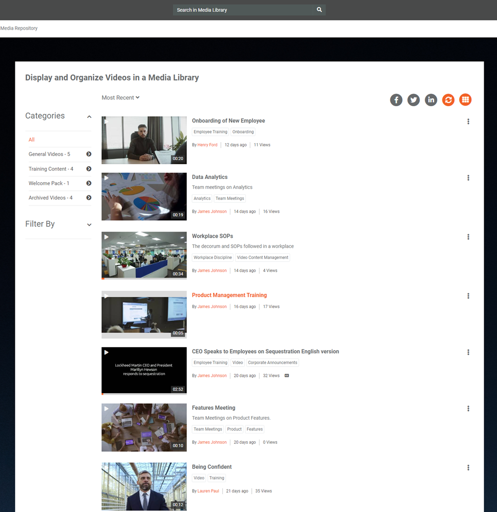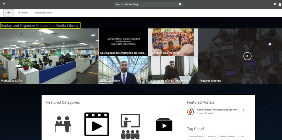 A user can create a personalized header layout for their Portal. A customized header section allows you to add text or an image that appears in the top header section of the Portal Homepage and Media Library Page. VIDIZMO allows its users to brand and modify their Portal's header from the Customize Header tab using the Portal Settings.
