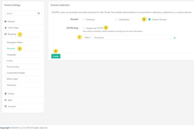 VIDIZMO offers you to customize your Portal the way you want. Out of the numerous available options, you can choose to configure the domain of your Portal. To learn more about the options you have, see: Understanding Domain Options for a Portal.