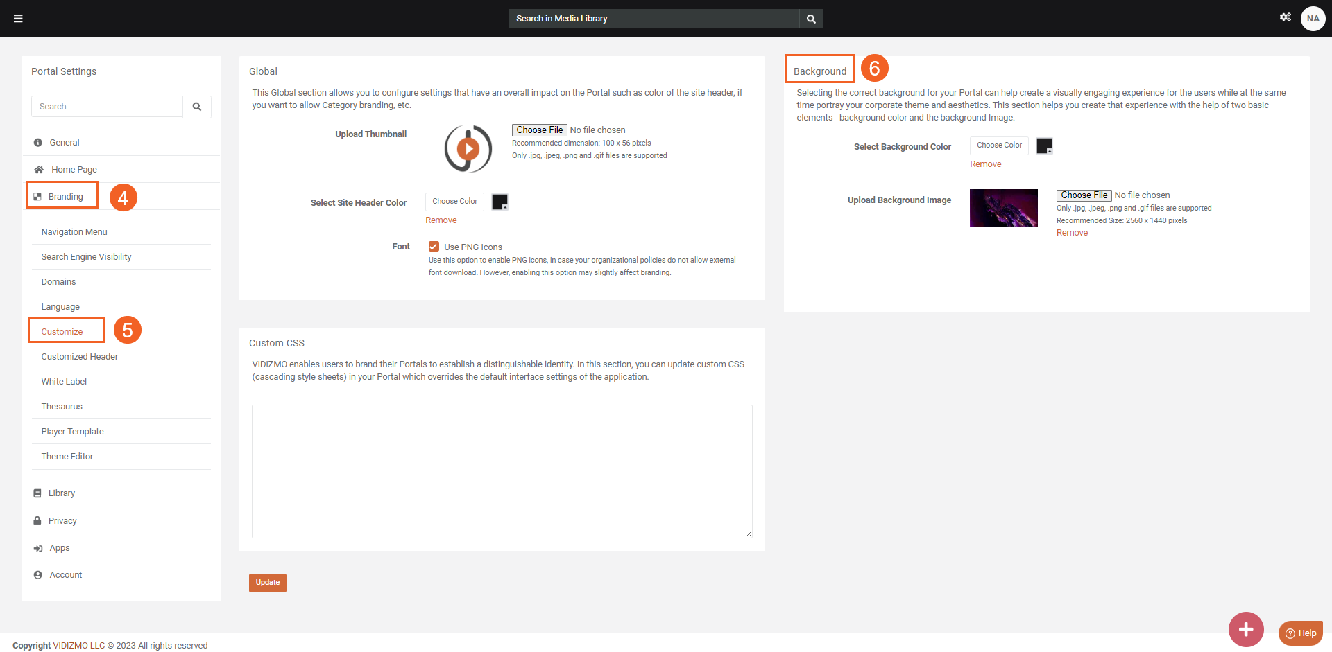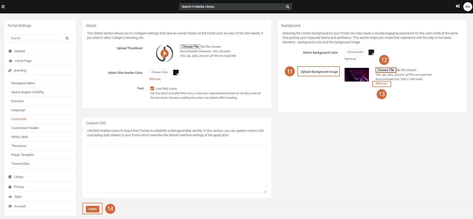 4. Click on the Branding to expand the list of operations that can be performed. 5. Select Customize option 6. Within the Customize screen, navigate to the Background section.