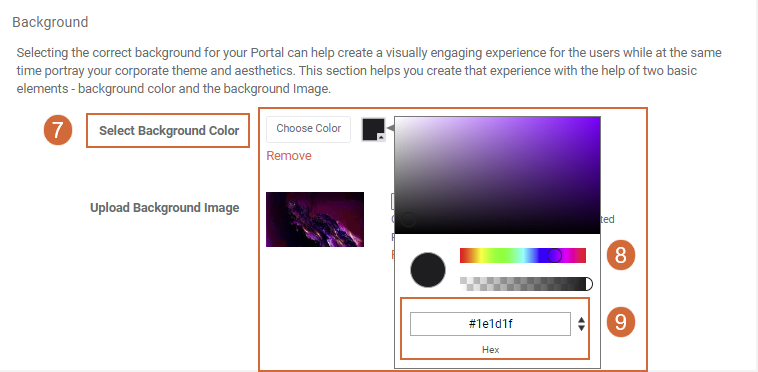 7. Click on the square box to designate the preferred background color. 8. Use the color selection pane to select your desired color by dragging the cursor. 9. Alternatively, you can precisely adjust the color using the provided hex code.