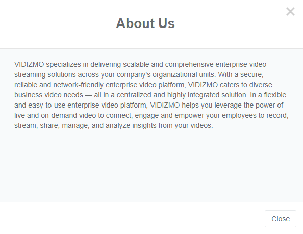 VIDIZMO allows users to brand their portals to establish a distinguishable identity. Through branding, you get the ability to upload portal's logo, set color of the header, set background color of your portal, upload background image of the portal that suits your organization's brand identity, so on and so forth. This helps familiarize users with the system and creates an environment they are accustomed to using. To learn more about VIDIZMO branding, see: Understanding Branding Settings.