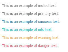 - Contextual Color: These are available contextual classes that correspond to the output text shown below respectively: .text-muted, .text-primary, .text-success, .text-info, .text -warning, .text-danger