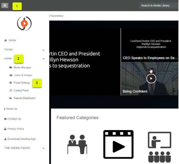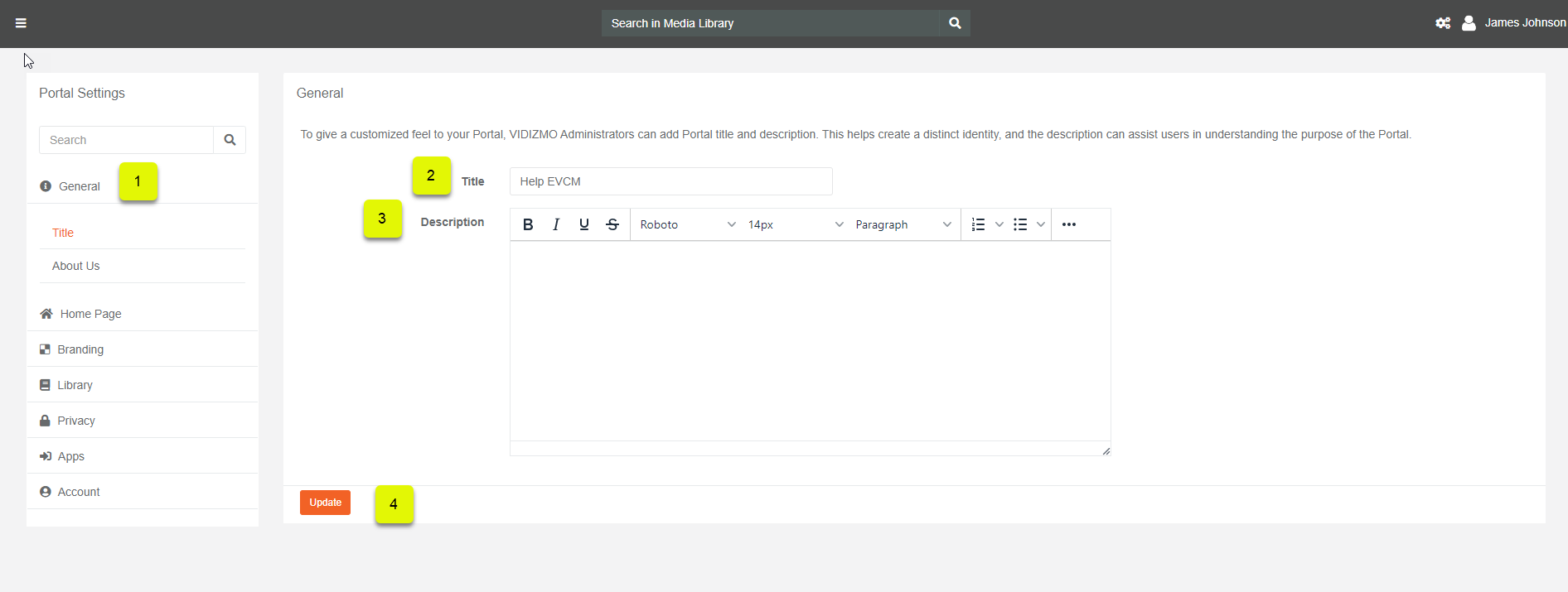 VIDIZMO allows users who have Portal Management permissions (via security groups or CAL) to perform the following steps to change the Portal's title and description: