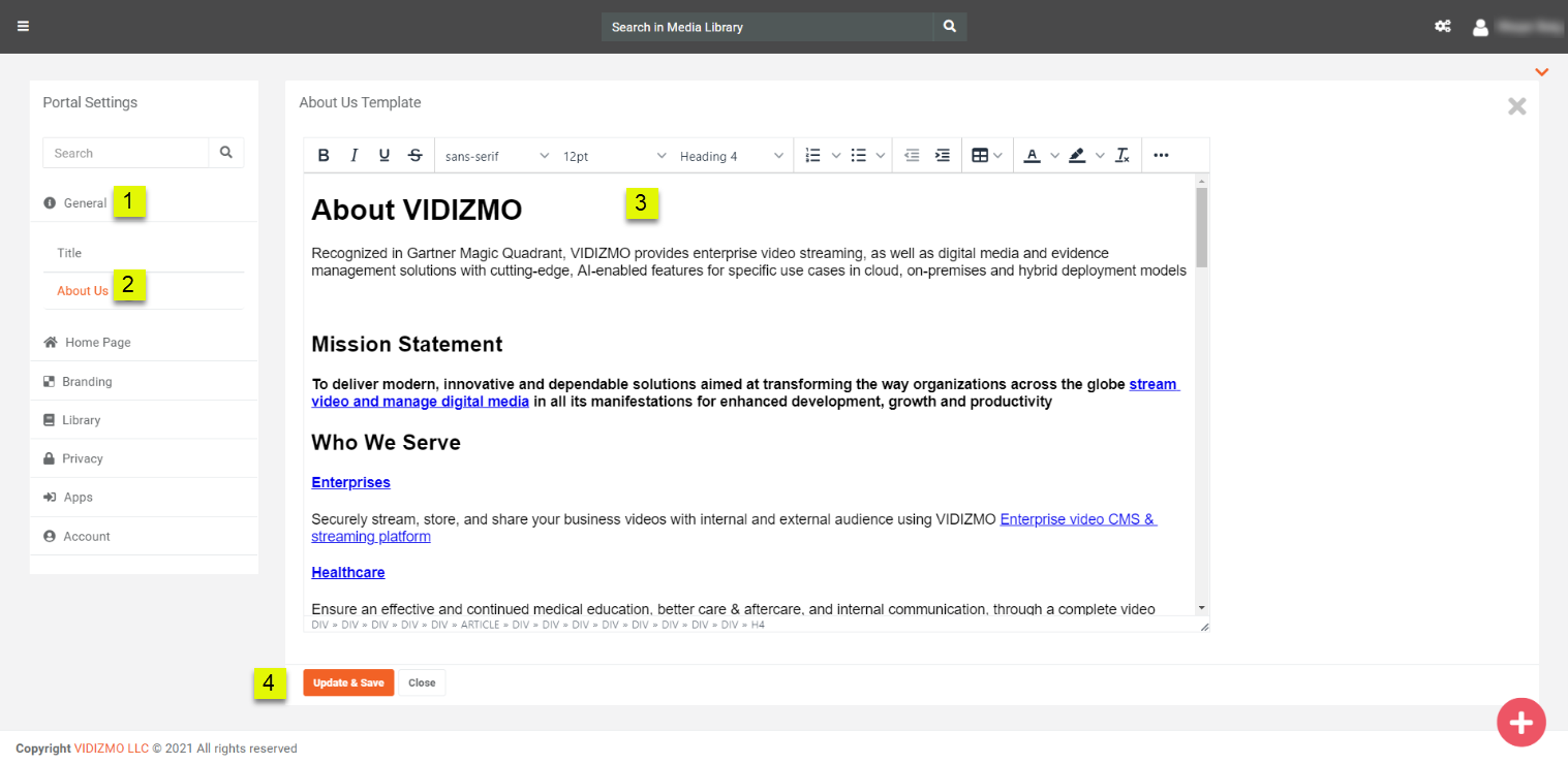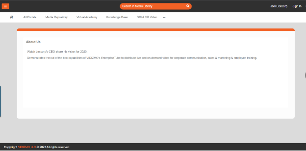 The about us page is generally used by all types of organizations to give users more insights into who is involved with a given business and exactly what it does. The history of the organization is often included and the histories of the personalities in charge are usually expressed through short articles usually accompanied by photographs. VIDIZMO allows you to define an About Us page with just a few clicks which helps you showcase your company and people profile in a nice and clean way.
