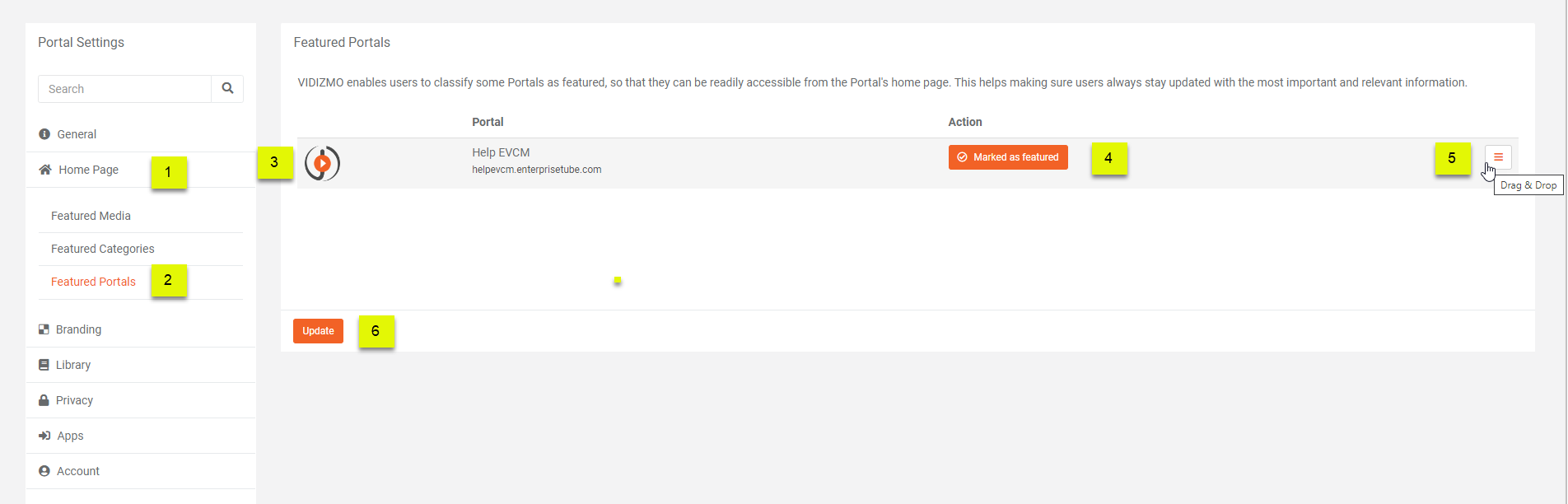 4. Click on the Mark as Featured button to feature the desired portal on the Homepage. 5. You can also drag a Portal in this list to change its position on the homepage by clicking and dragging the icon. 6. When you are done arranging your Portals, click on the Update button for the changes to become effective .