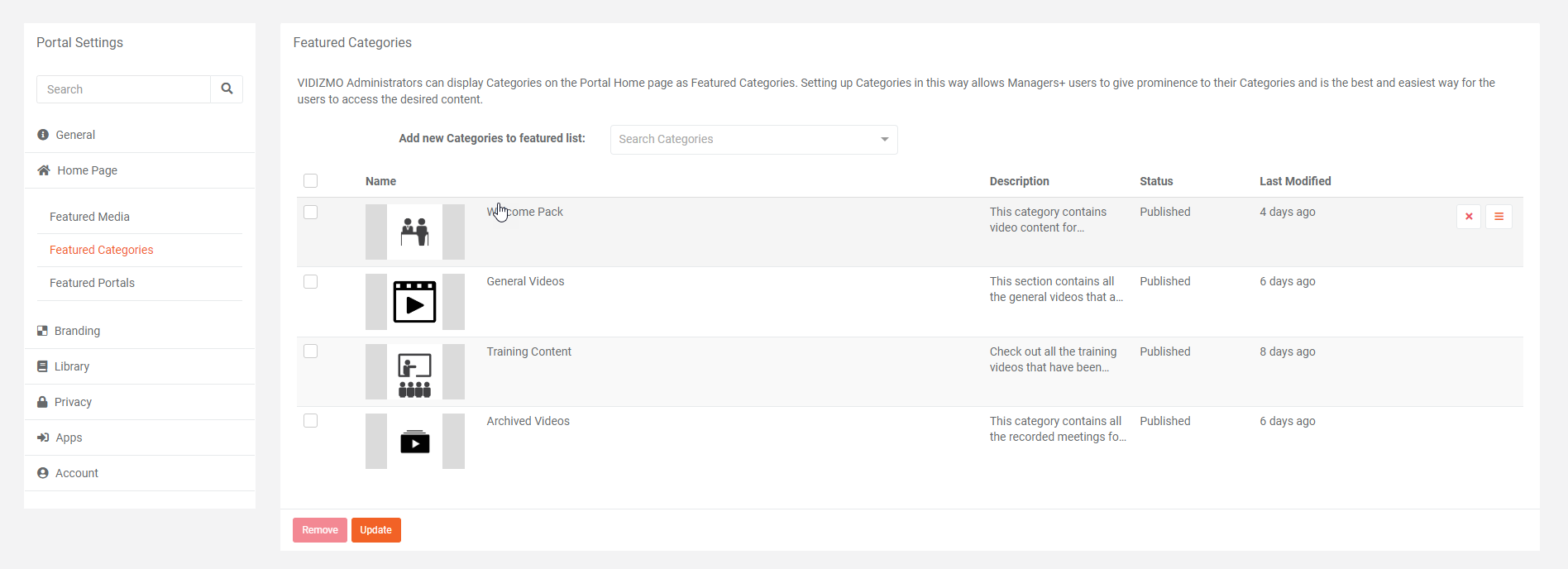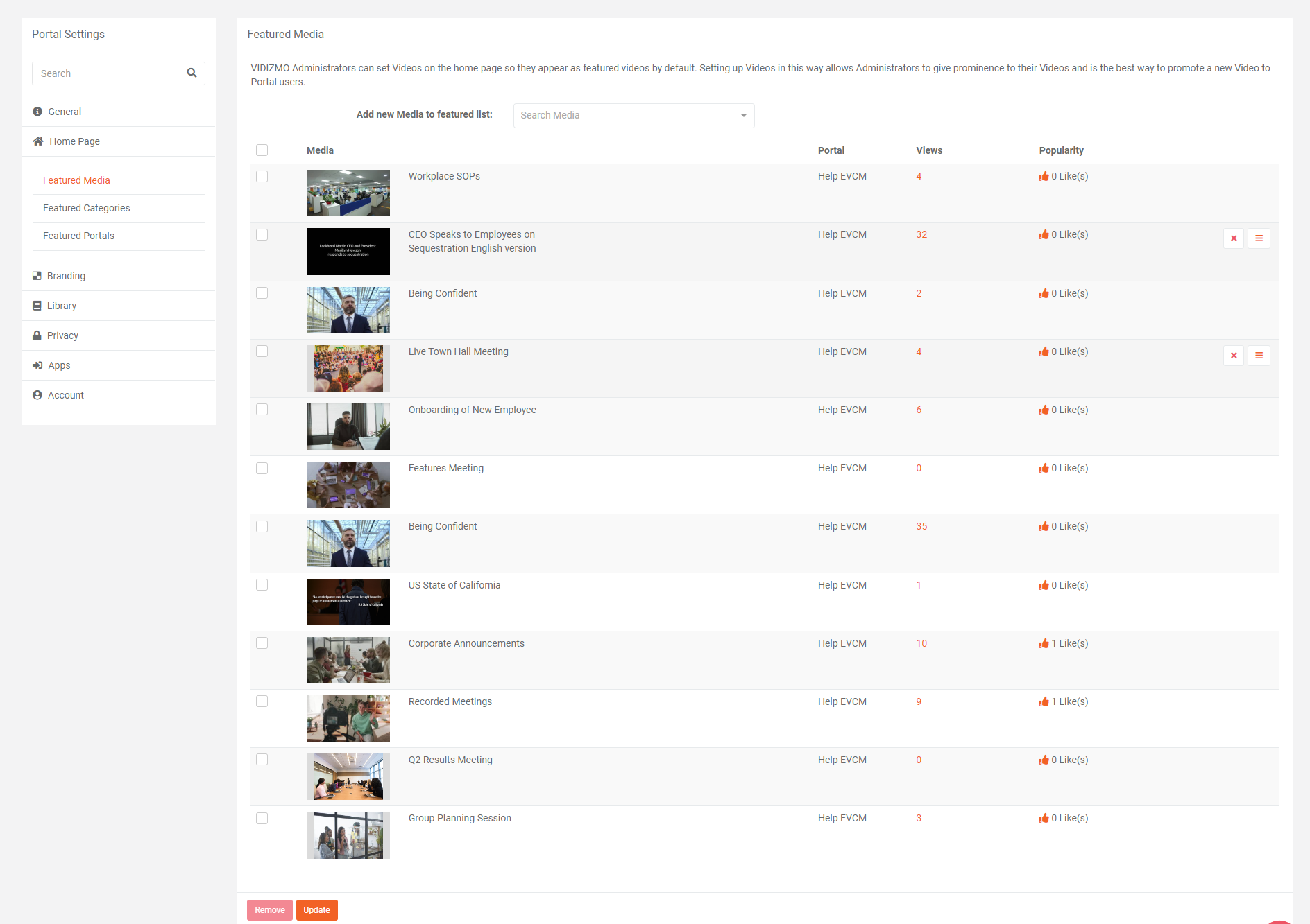 Users can set media as featured from Homepage tab in Portal Settings. Uploaded media can be added or deleted from the featured list, and they can also be reordered to change the sequence in which they are displayed. Read here to learn How to Feature Media on Homepage.