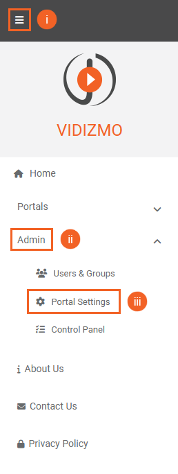 - From the Portal's Homepage: i. Click on the menu icon on the top left-hand corner of the screen to bring up the left navigation pane. ii. Then click on the down arrow to expand the Admin section. iii. Select Portal Settings.