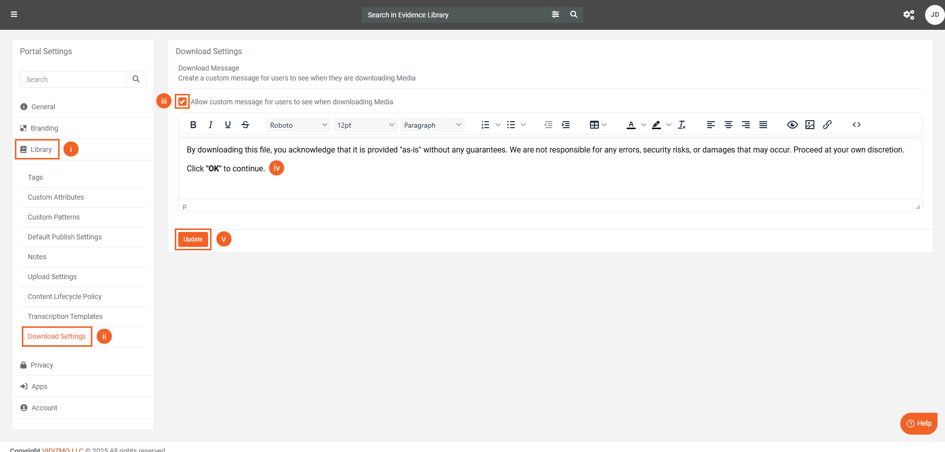 - From the Portal Settings navigation pane: i. Click on Library to expand the list of operations that can be performed. ii. Select Download Settings. iii. Select the checkbox to enable the download message functionality. iv. Enter the message that you want to display to the users upon download. v. Click the Update button to save changes.
