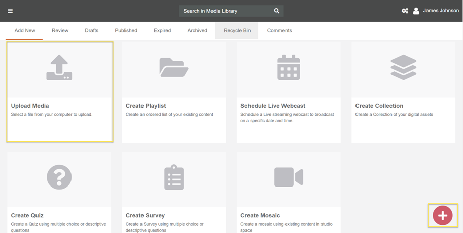 - Click on the red Add New Media (+) icon towards the bottom right-hand corner. You will be redirected to the Add New Media page.