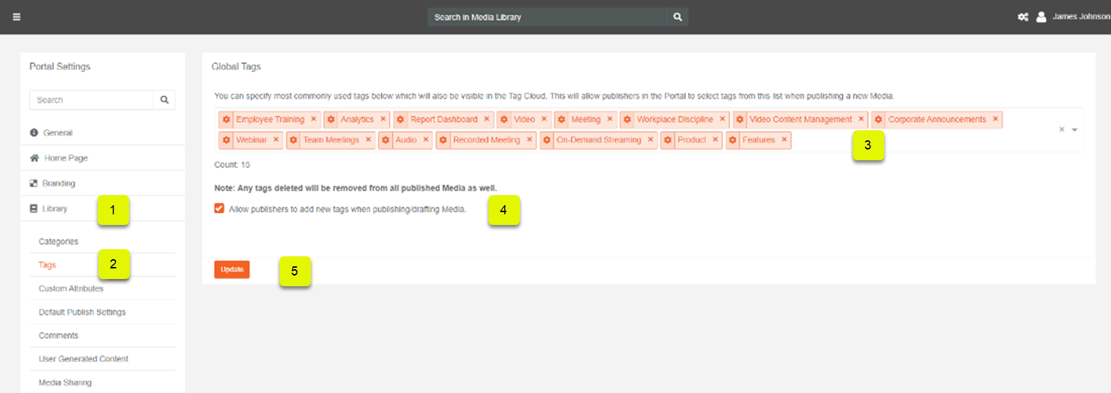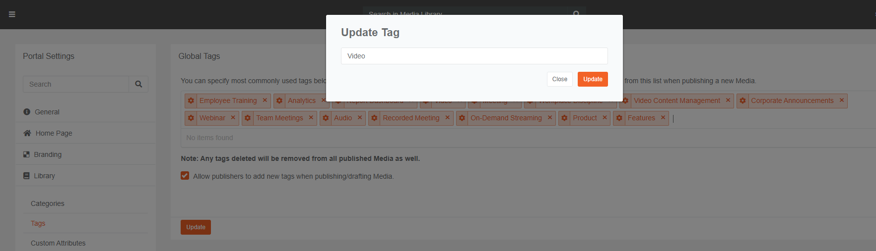 The Enterprise tags are configured on both Account and Portal levels, while the portal can inherit tags from the Account. VIDIZMO has a feature to add tags during publishing and editing media. Users can add or select tags while publishing media if the Administrator has pre-defined the enterprise tags. If an Administrator deletes any tag which is used in any media, then it will be deleted from all related media as well.