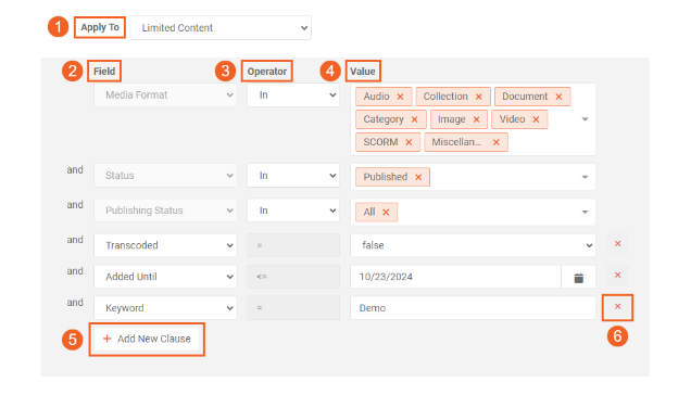 - If 'Limited Content' is chosen, you can define a criteria using clauses for more specified content selection. Each clause is comprised of a Field, Operator, and Value.