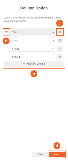 a. Add a new column via the ‘Add New Column' button. b. Reorder the column by dragging the icon next to their name. c. Remove columns using the 'x' icon. d. Use the Apply Button to save your adjustments.