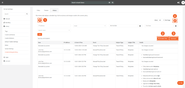 The History tab displays a log that documents any changes to a policy and all instances of its execution since its creation. The log also displays information such as how the policy was executed, who executed it and how many files were affected by the policy action. You can also perform the following actions in this section:
