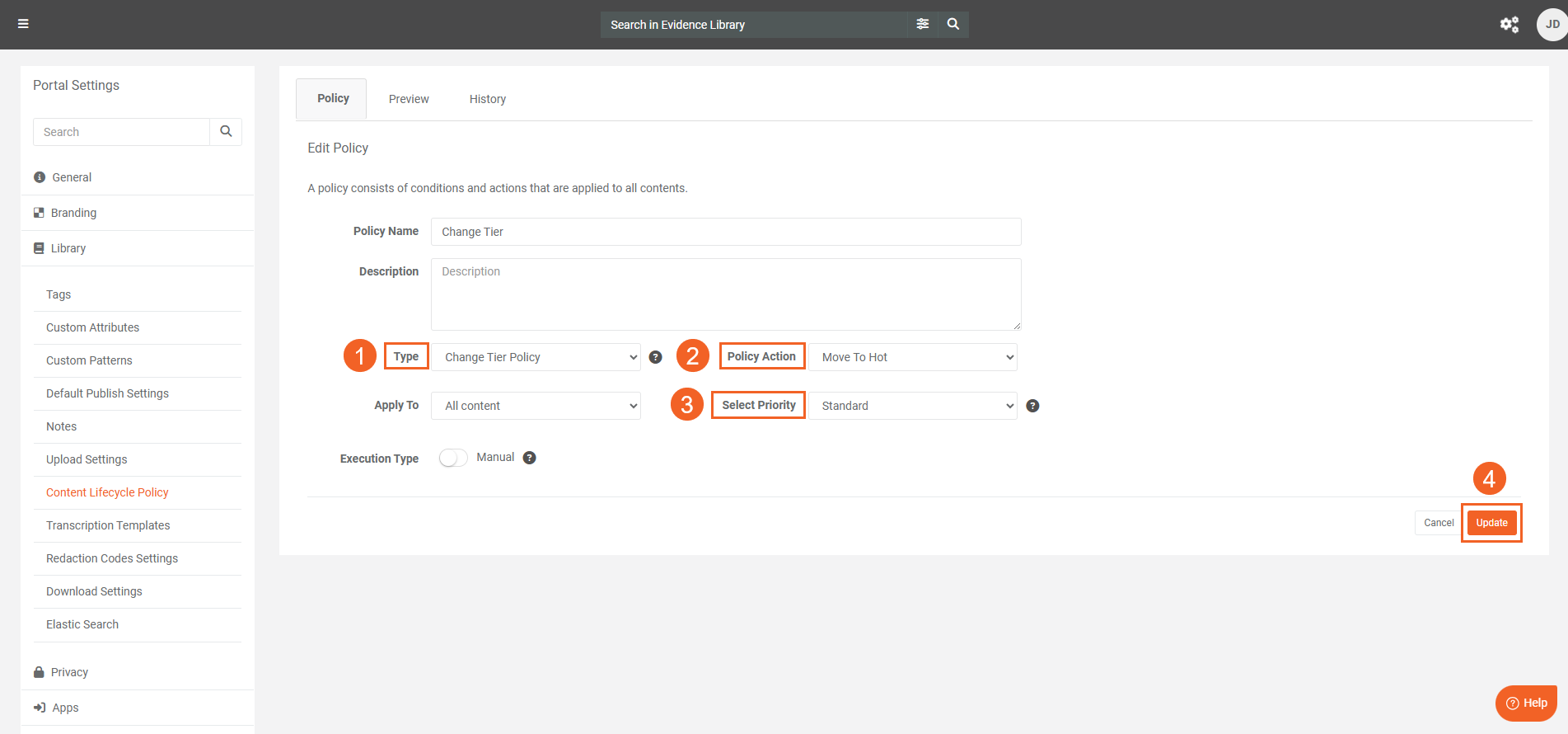 Change tier policies become available when you are using an Azure storage on your Portal. When a 'Change Tier Policy' is executed, the Portal content moves to the access tier specified in the 'Policy Action'.