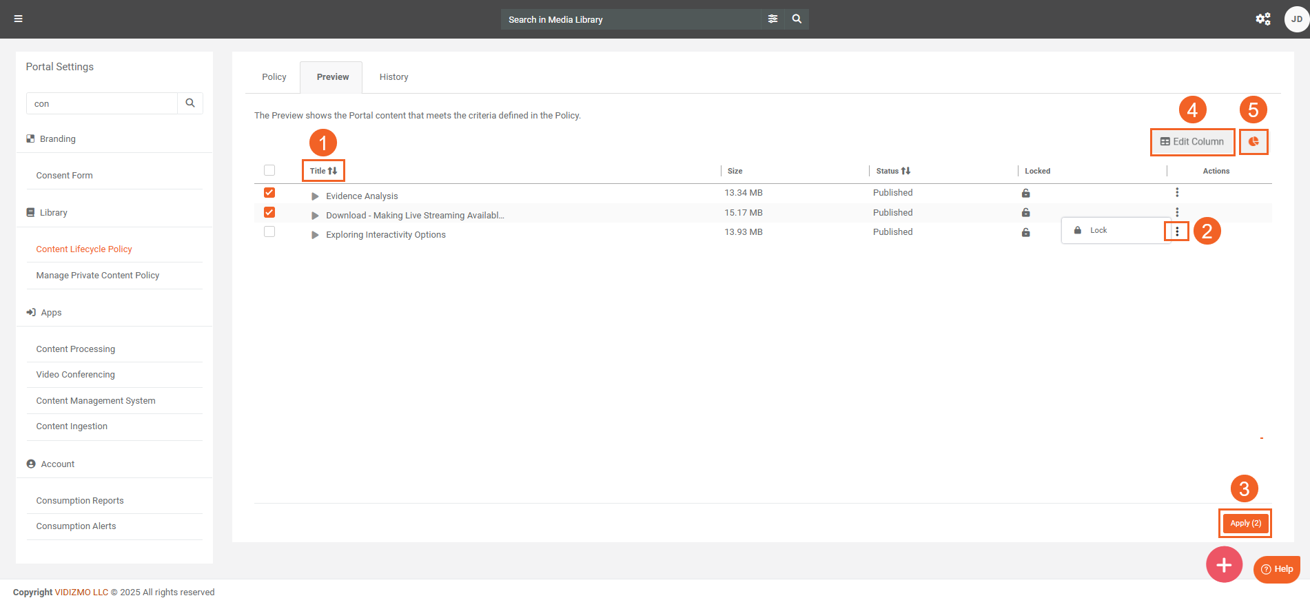- You can use the menu under ‘Actions' to lock or unlock content on the preview screen to prevent them from being affected by the policy action. You can also identify whether an item is locked or unlocked by the icon in the ‘Locked' column. For more information, see: Use Lock in VIDIZMO to Restrict Content Archiving.