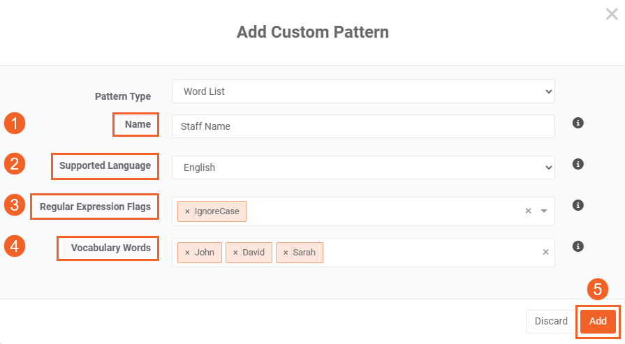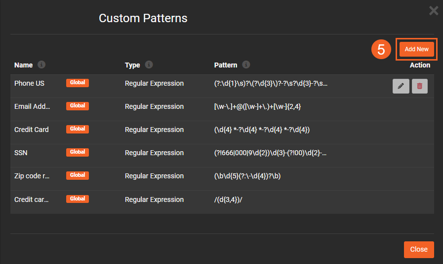 - On the Custom Patterns screen, all existing regex-based custom patterns are listed. Select Add New to add a new pattern.