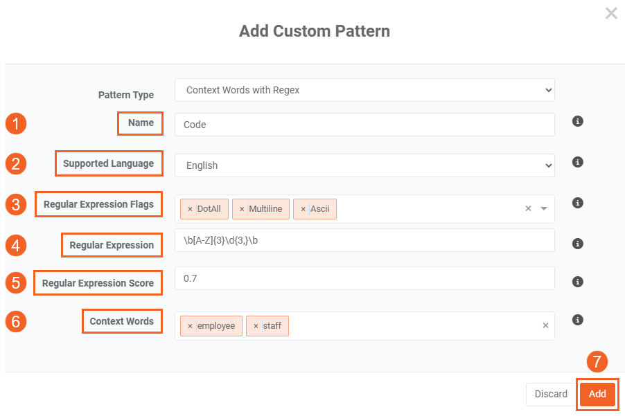 Regular expression flags control how matching behaves for your custom PII. Regex flags apply to custom patterns using both the regex and vocabulary (Word List).
