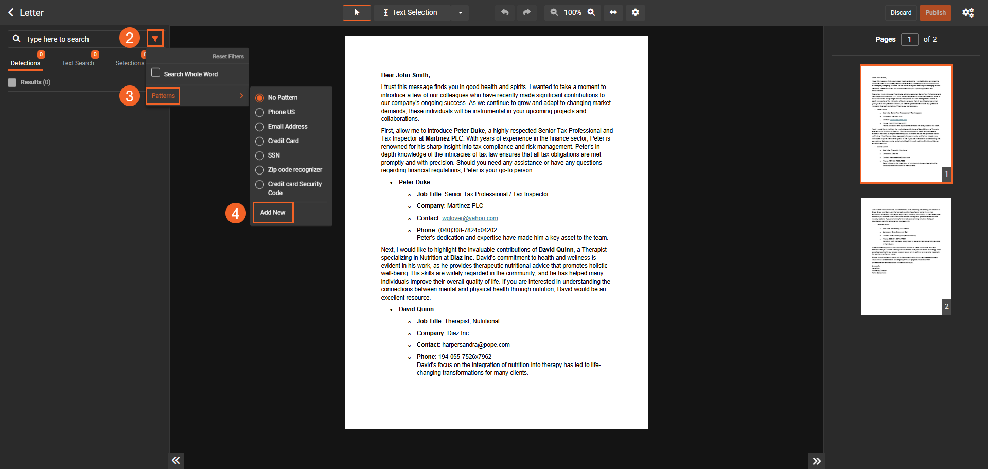 Note: Document redaction in Studio Space currently supports Regular Expression patterns only. Word list and Context Words with Regex aren't available.