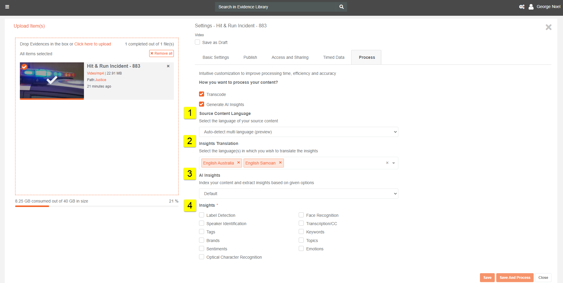 Select whether you want to transcode the media and generate AI Insights from the uploaded file.