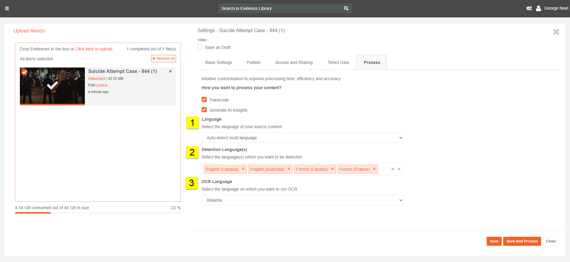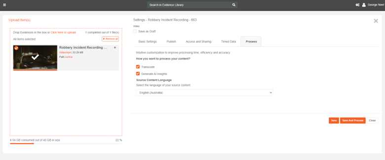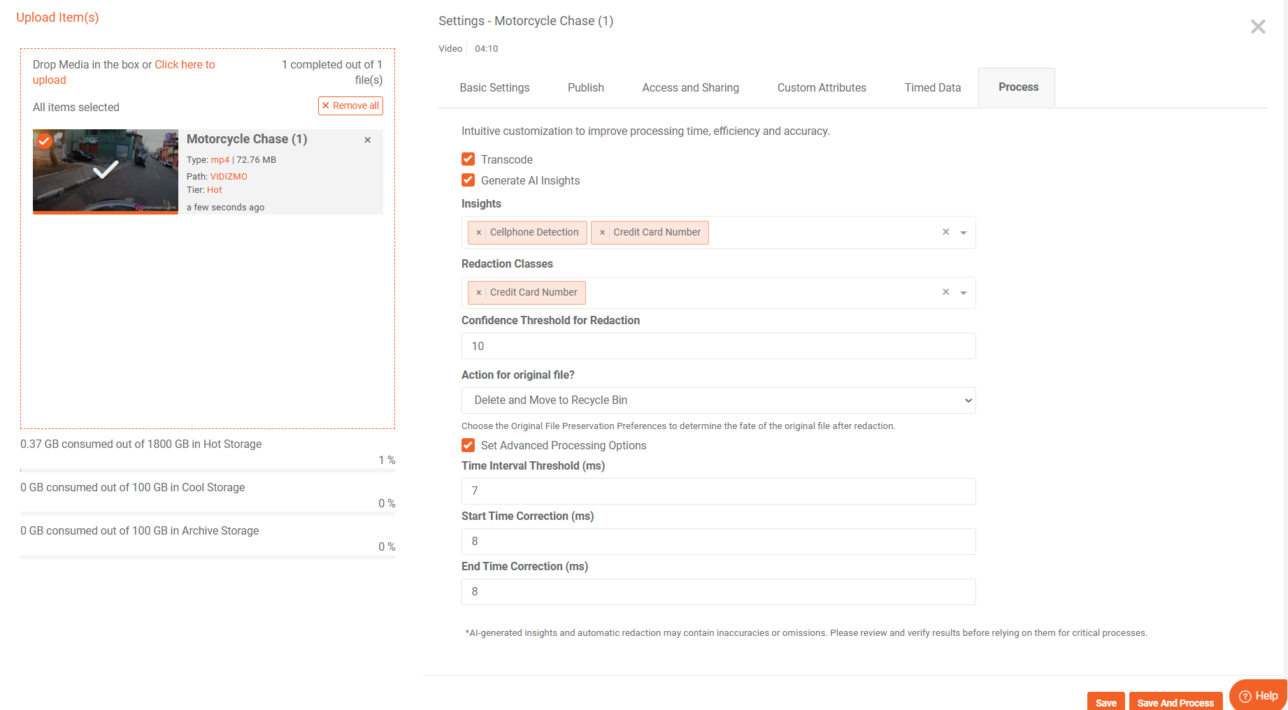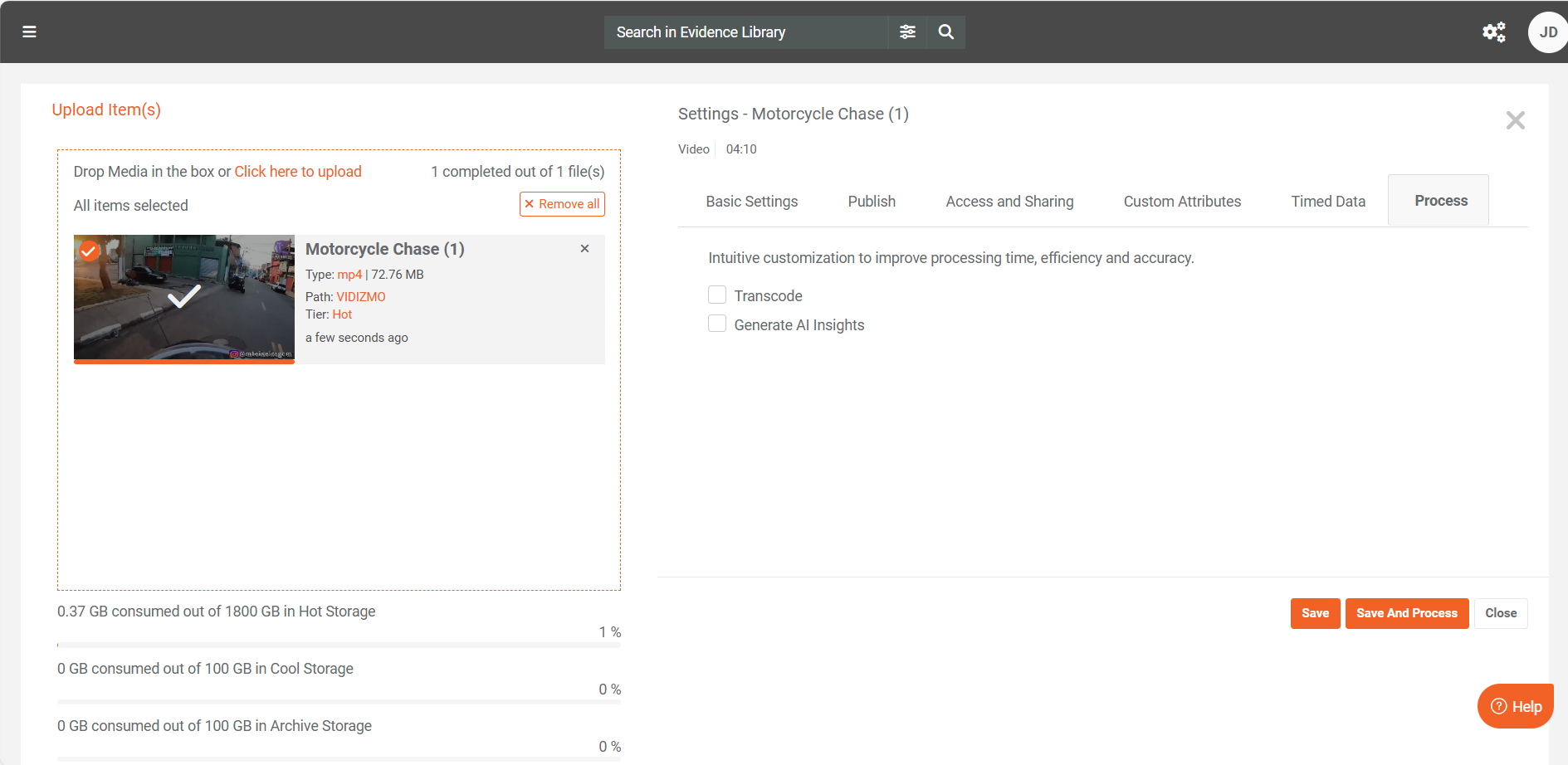 VIDIZMO now gives you the power to select custom processing settings while uploading your media. You can choose whether to transcode your media or extract AI Insights. With this new feature, users can pick the option that best fits their needs for each individual piece of media, providing a more personalized and efficient experience.