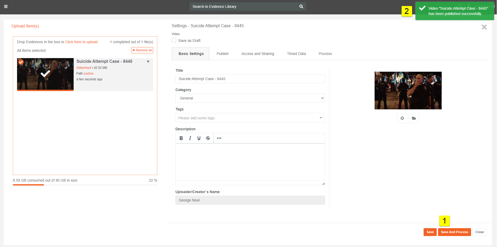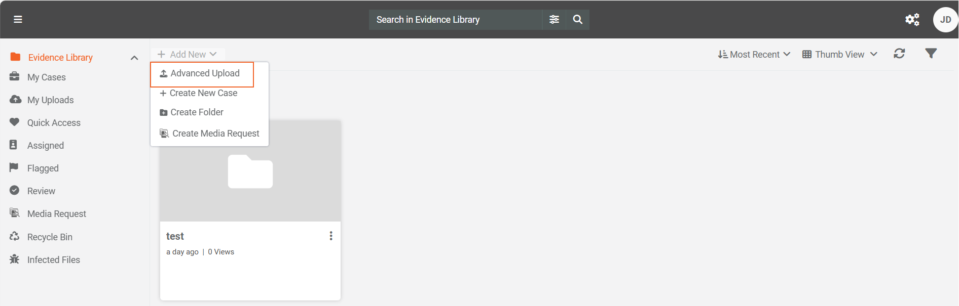 - For Digital Evidence Management: On the Home page, click + Add New, then select Advanced Upload from the dropdown menu.
