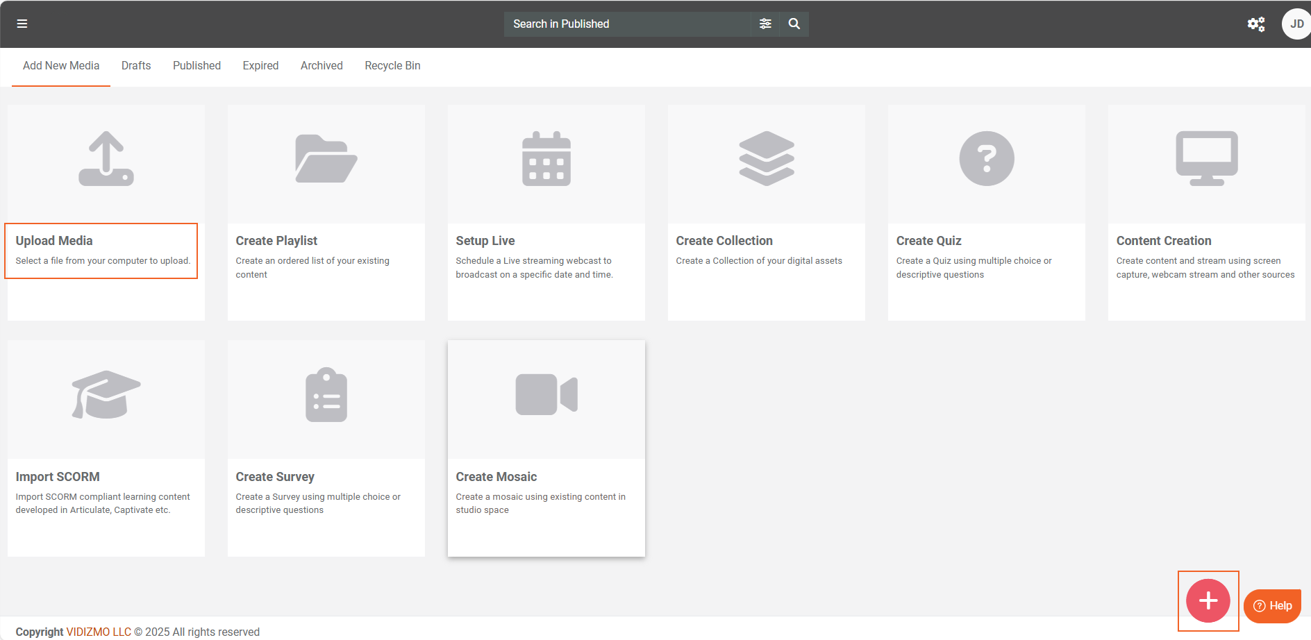 Now, navigate back to the Library and upload your content by following the steps below. The upload process is similar for both products (Digital Evidence Management and EnterpriseTube), with minor differences in where the upload option appears.