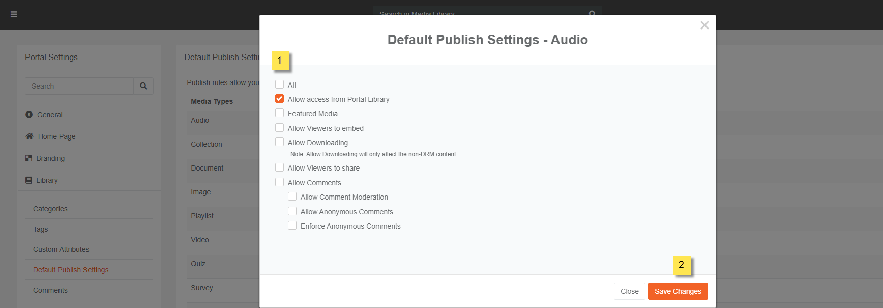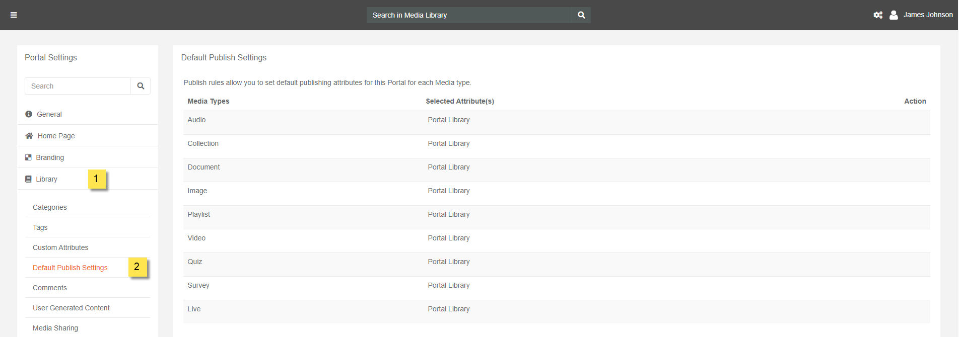 VIDIZMO Managers+ can pre-define publishing rules for content. These rules are primarily the behavioral settings for content uploaded on VIDIZMO. These set of rules could be applied to new as well as published media types as per the user choice. Manager+ roles can set default publishing rules such as if they wish to allow access to the content from Portal Library and/or Homepage, enable content downloading, embedding so on and so forth.