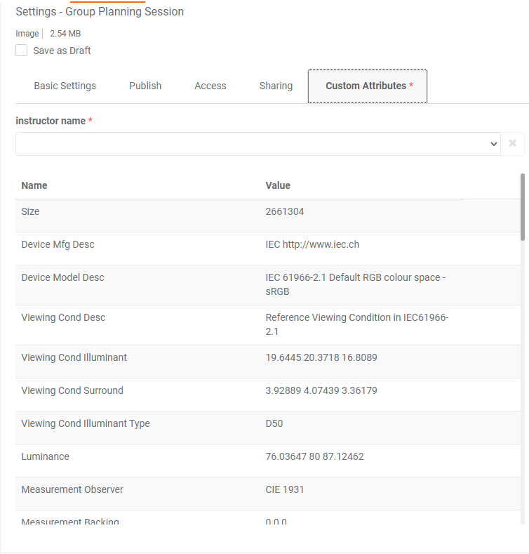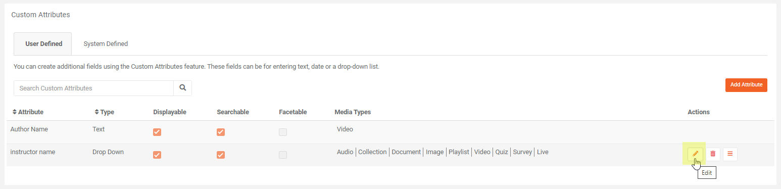 III. To view the custom attributes, navigate to the Media Manager and select any media, then select the Custom Attributes tab in Media Settings (in the screenshot below, Instructor Name is a custom attribute).
