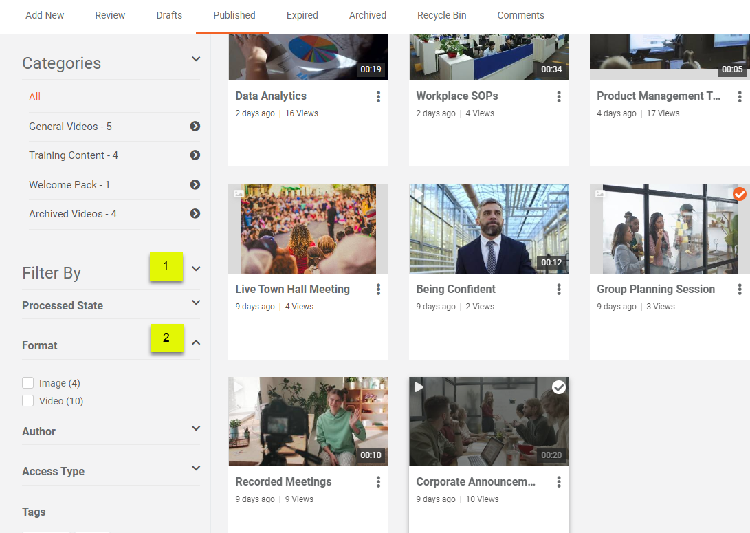 Custom attributes can be marked as mandatory for all the content available in media management or can be specified to audio, documents, images, presentation, quiz, surveys, and videos. Additionally, these attributes help enhance search and appear as filters when searching for media.