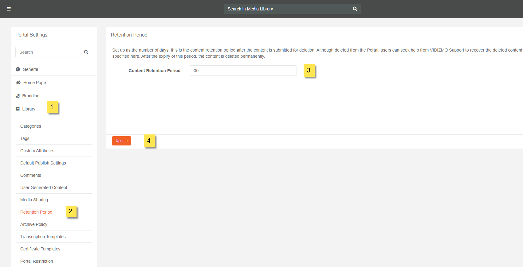 VIDIZMO enables its users to set the content retention period after the content is submitted for deletion. Although deleted from the Portal, users can seek help from VIDIZMO Support to recover the deleted content within the time specified here. After the expiry of this period, the content is deleted permanently.