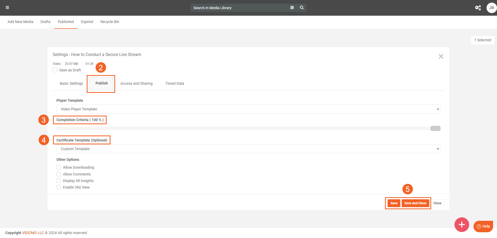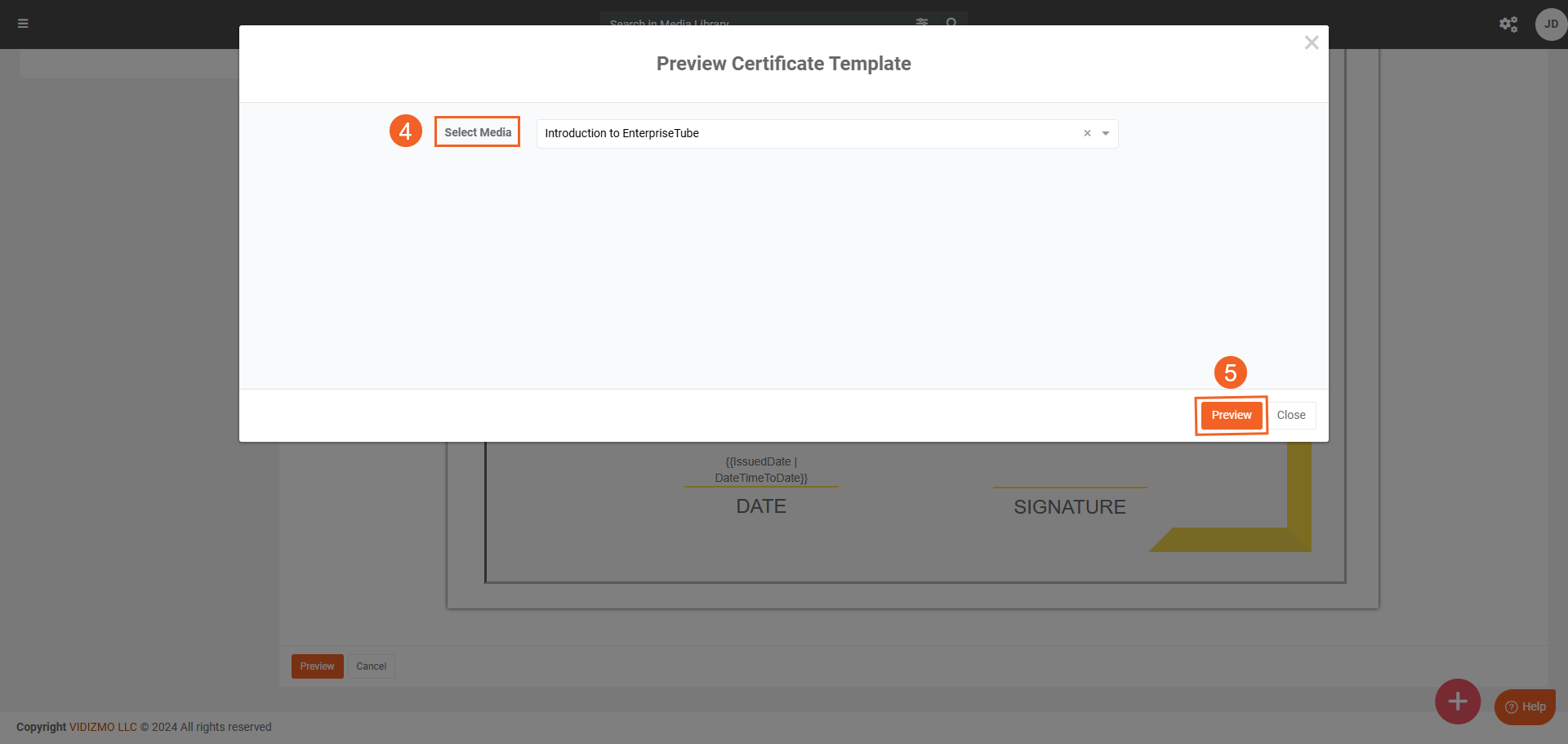 After creating a certificate template, follow these steps to assign it to the Media files.