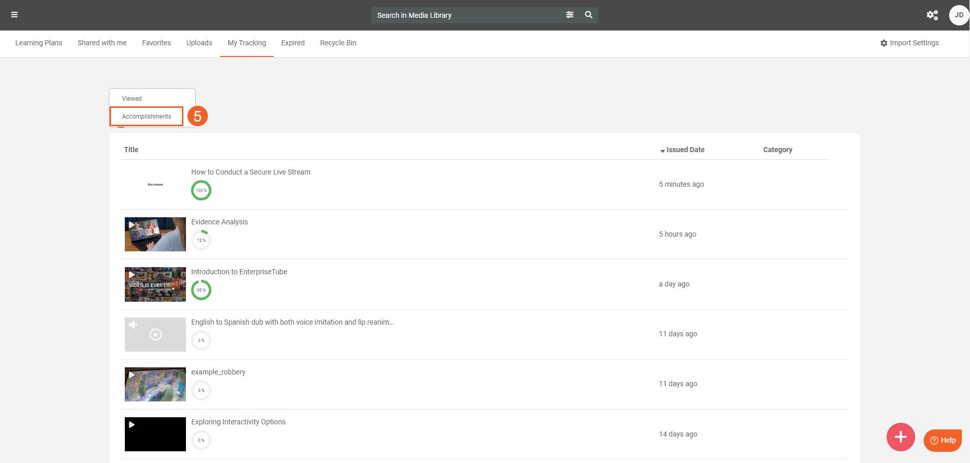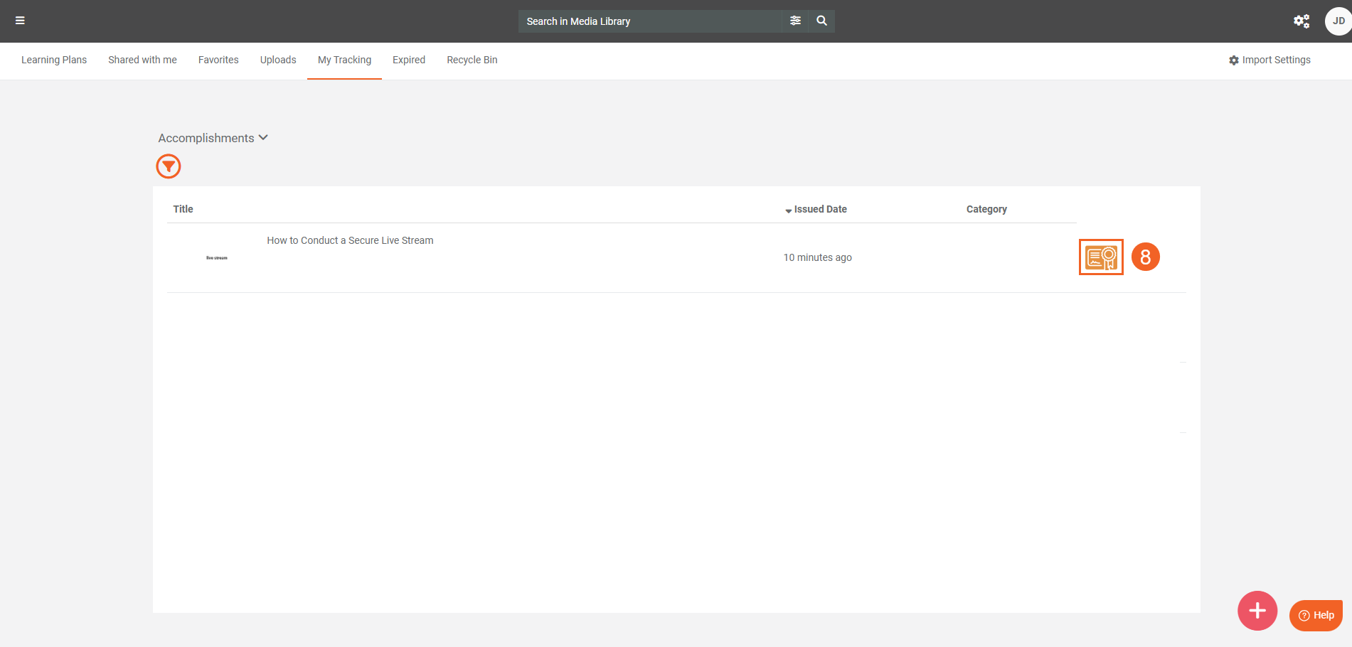 - The Accomplishments view displays awarded certificates and their corresponding Media. Click the certificate icon to download the completion certificate for that Media.