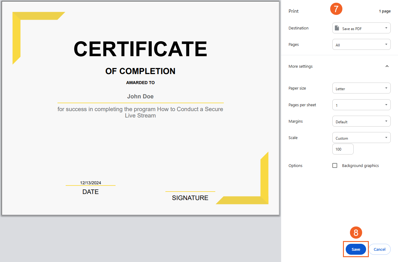 - Click the Save button to download the certificate after making adjustments.