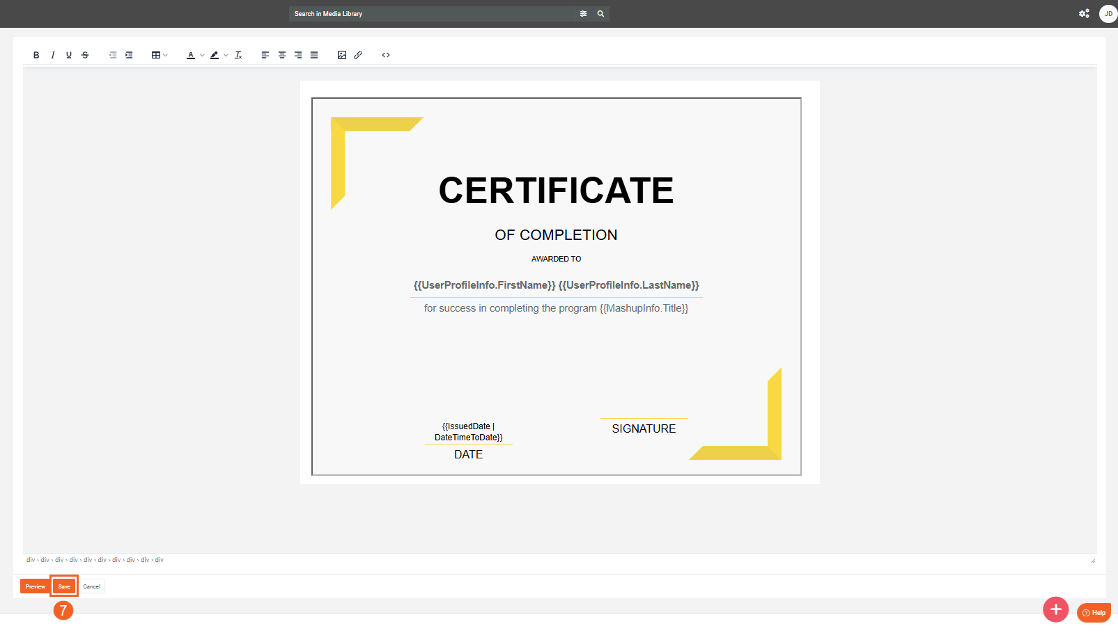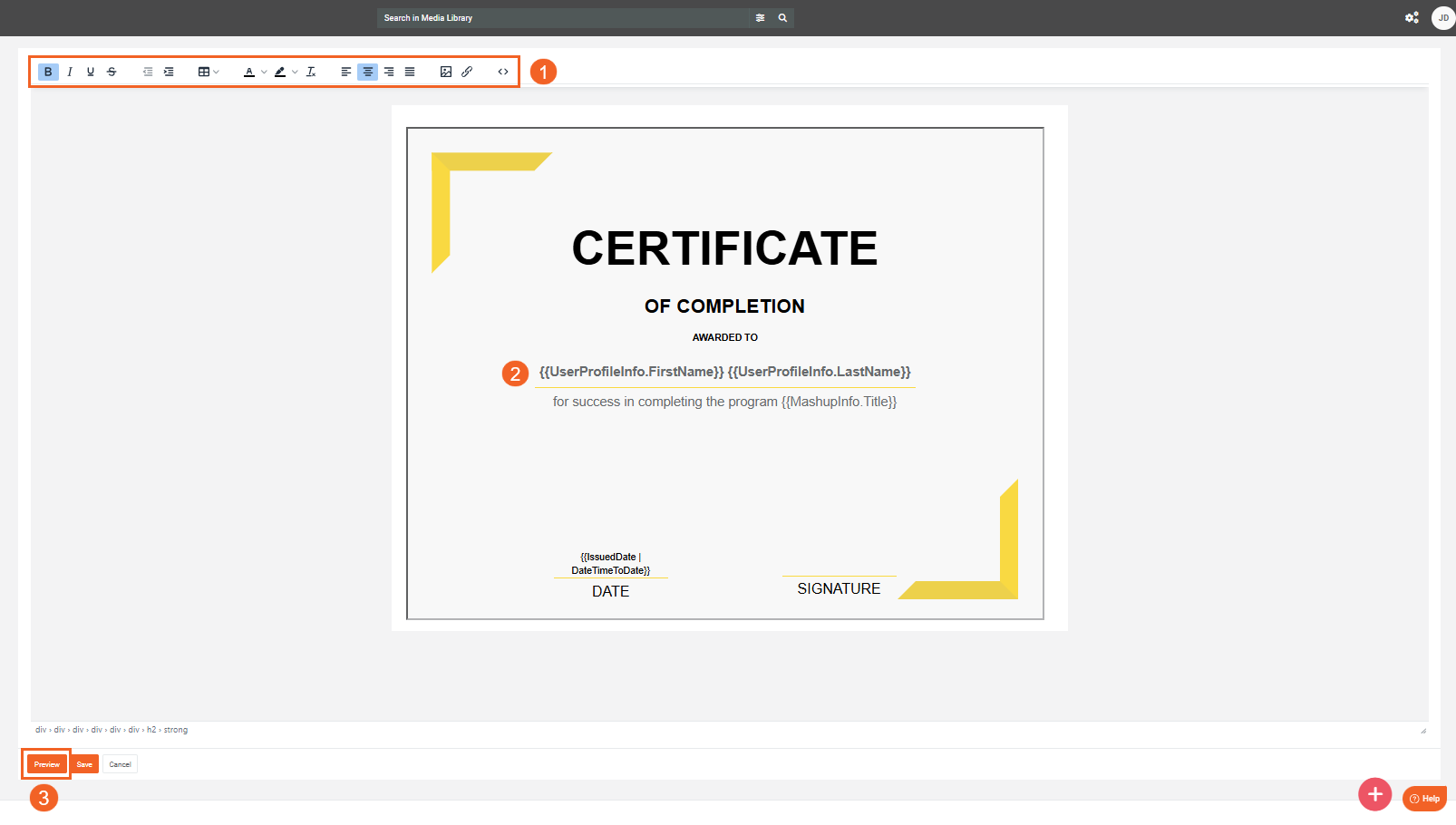 - Select a published Media to preview how the certificate will appear for it. The preview replaces variables in the template with information obtained from the Media's attributes.