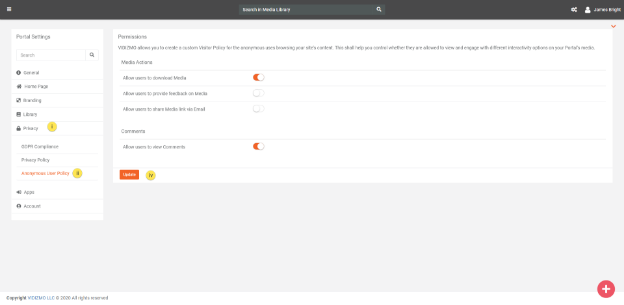 VIDIZMO allows you to create a custom visitor policy for anonymous (or public) users browsing your site's content. This will help you control whether they are allowed to view and engage with different interactivity options such as media sharing, downloading, reporting, and commenting on your Portal's media.