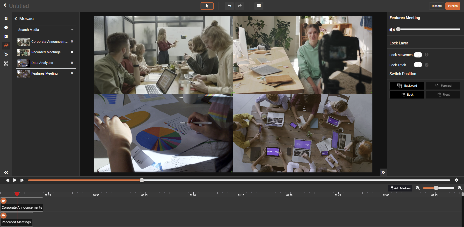 Customized layout of mosaic could be defined by switching positions and changing size of player by dragging its corners. Players can be resized at any point of editing. Any player that is pushed out of canvas will not be a part of final mosaic. After resizing the player according to your desire you can lock your player so that you will not end up moving it mistakenly.