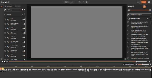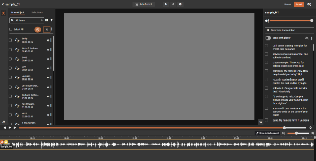 - Based on your selected PII types, the filter will display the respective audio segments on the left pane.