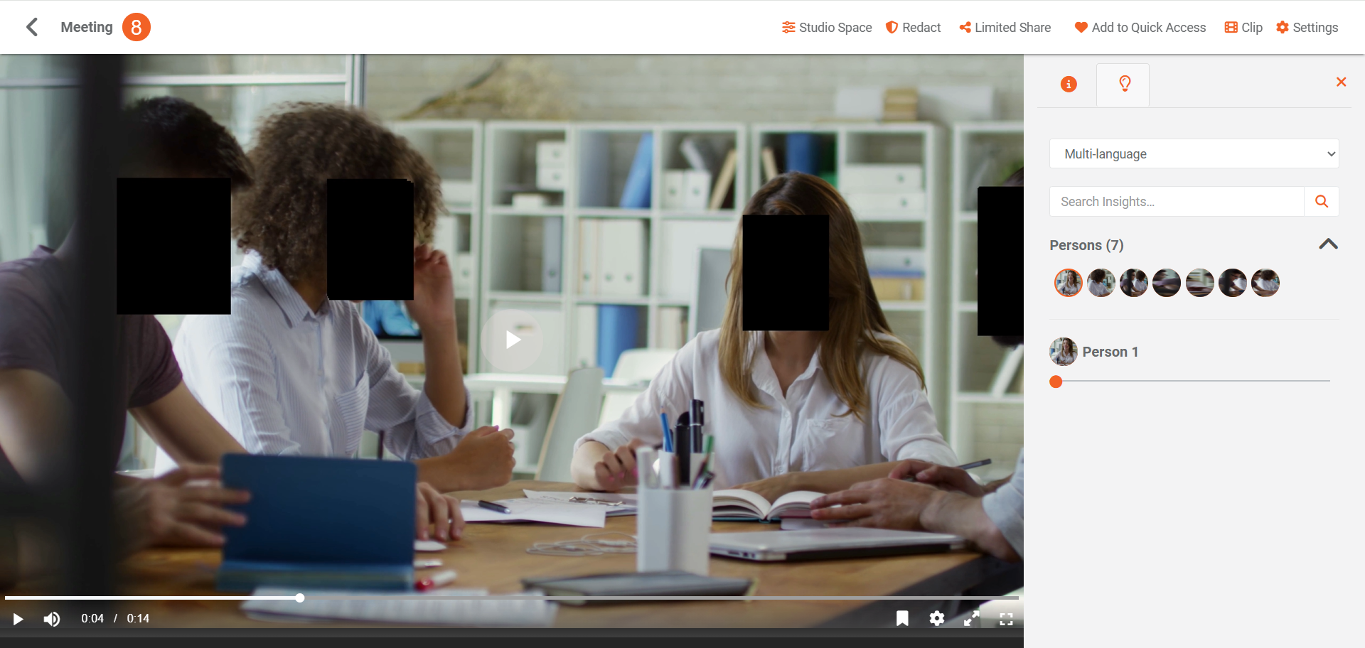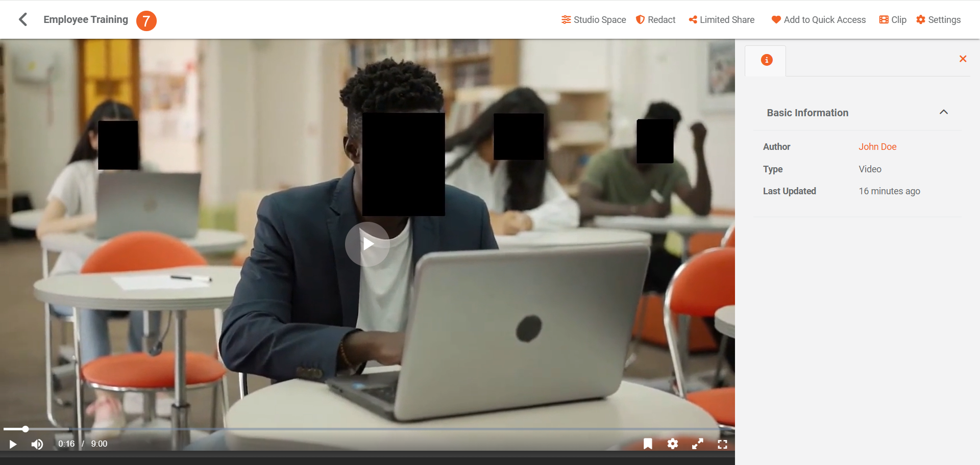 - Once processing is complete, the output will be generated according to the selected Advanced Processing option. Since Override Original File is selected, processing happens on the original file. Click your processed content to open its playback page and see the redactions.