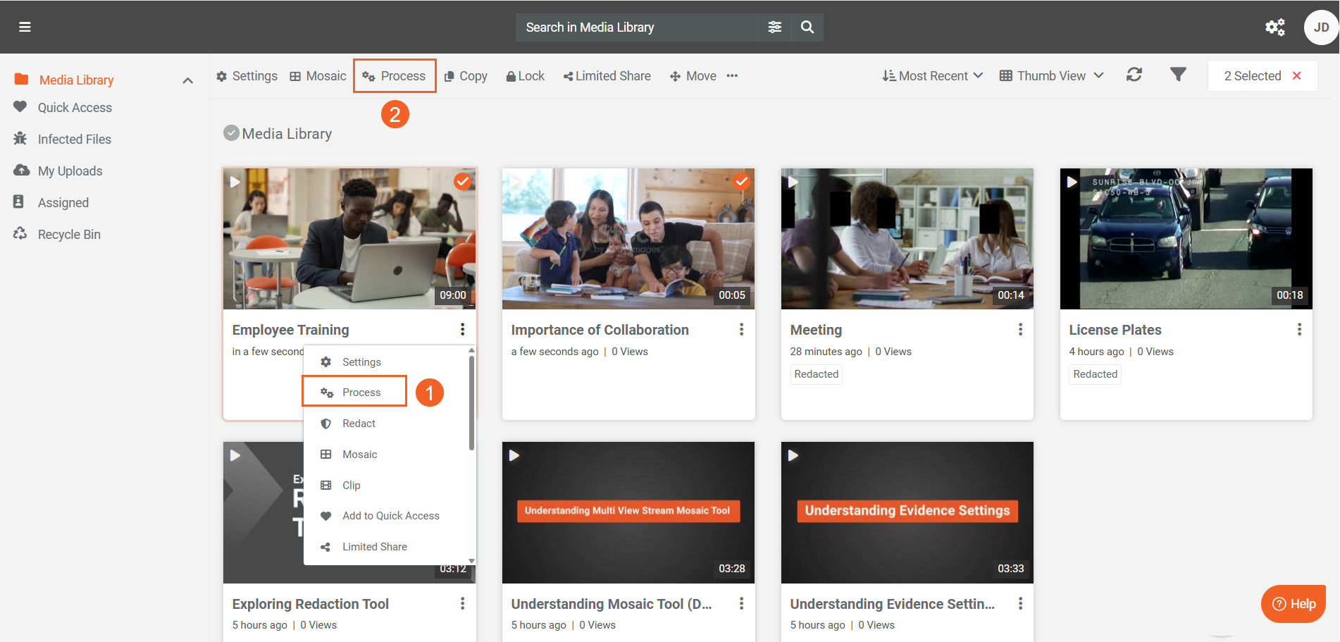 - To process multiple items for automatic redaction, select your desired items and click Process from the header menu.