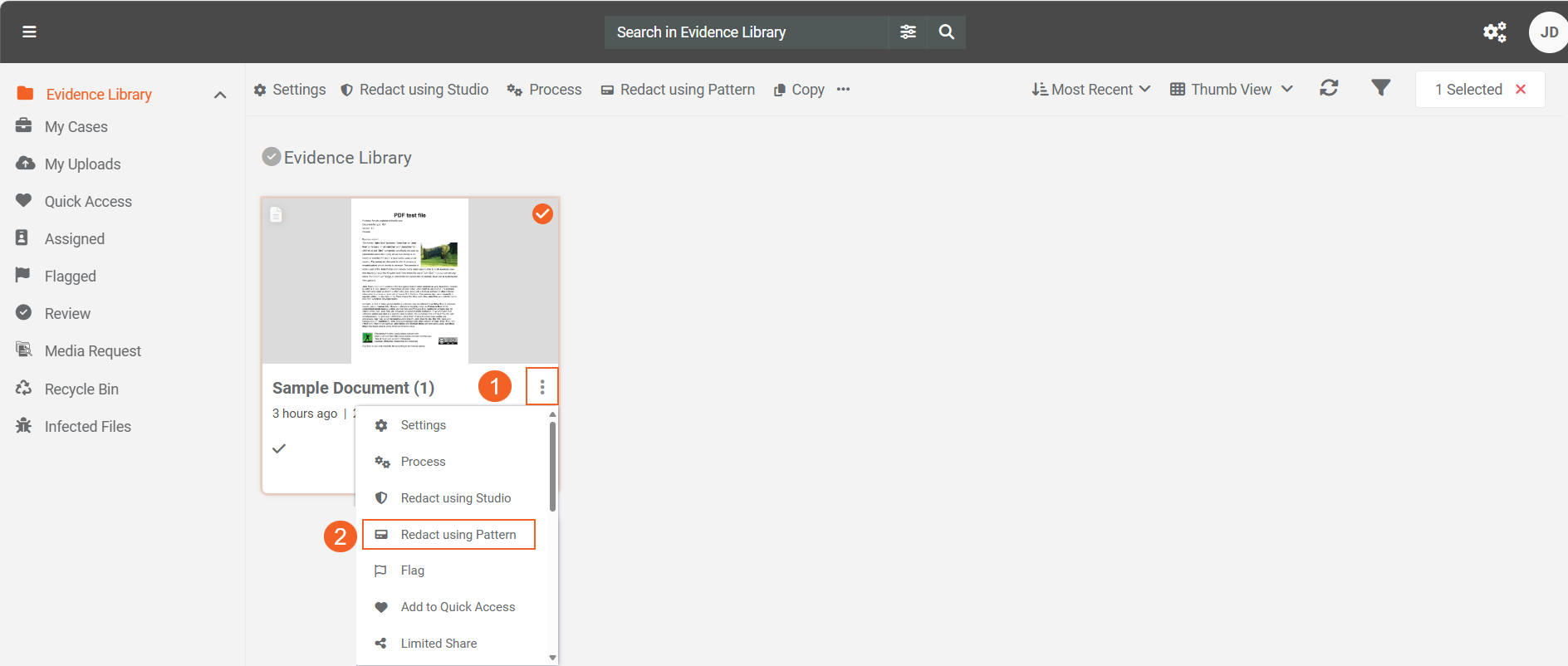 Alternatively, to apply redaction to multiple documents, select the documents you want to redact, and then choose Redact using Pattern from the header.
