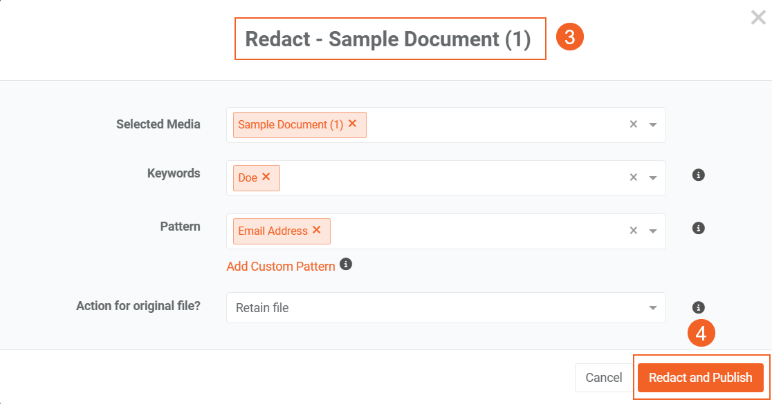 If your application is configured for automatic processing, uploaded files are automatically scanned and redacted based on your defined custom patterns. If automatic processing is turned off, this article describes how to manually apply redaction and detection for custom patterns in the VIDIZMO portal.